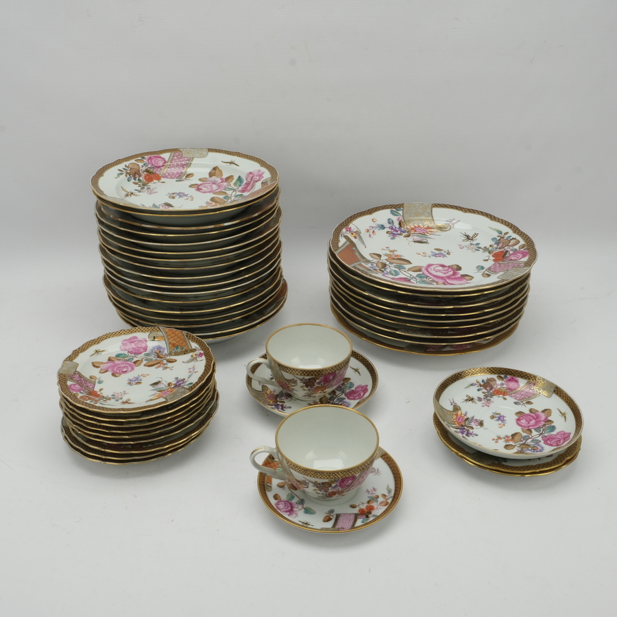 Lot diverse serviesdelen: zeventien soepborden (23 cm), allen ongemerkt, motief Lowestoft Rose. Met daarbij negen dinerborden, (26 cm), negen gebaksbordjes (16 cm), twee kop en schotels en drie ...