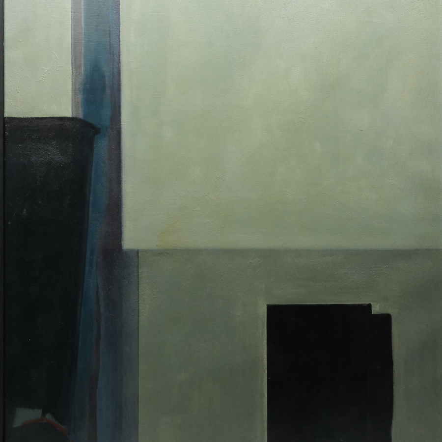 Schilderij, olieverf op tempura 80 x 100 cm. ‘Schoorsteen II’, op de achterzijde gesigneerd Jan Roos (1951), gedateerd 1980