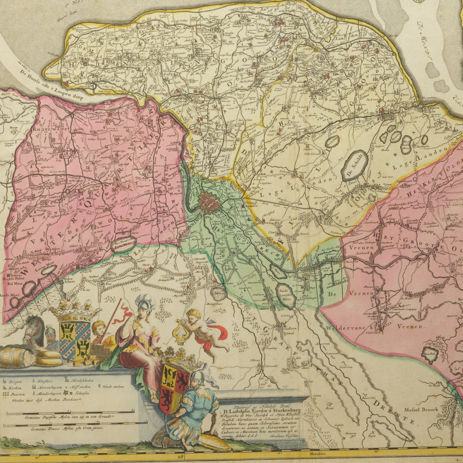 Een hand ingekleurde 17e eeuwse kaart van de provincie Groningen. Gronigae et Omlandia Dominium vulgo De provincie van stad en lande. Uit de atlas van Van der Hagen. Gelijst.