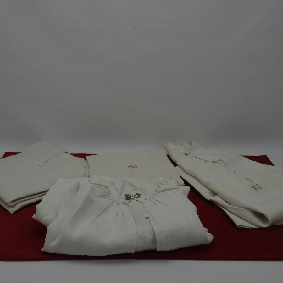 Lot van vier diverse linnen hemden, o.a. gedateerd 1712, 1757 en 1790. Eén met zilveren knopen