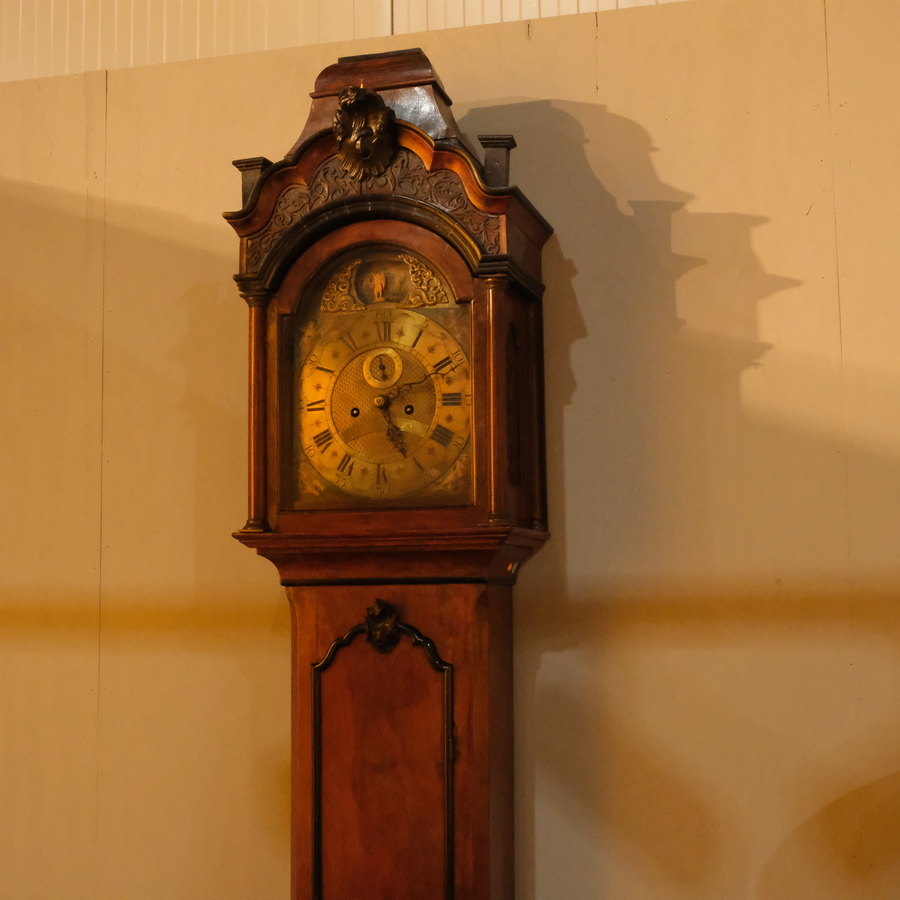 Een 18e eeuws Amsterdams staand horloge, met mechaniek van Vadertje Tijd en in de hoeken beschilderd. Uurwerk met dubbele bel. Met houten poppen op de met ajour zaagwerk versierde kap. Gesigneer...