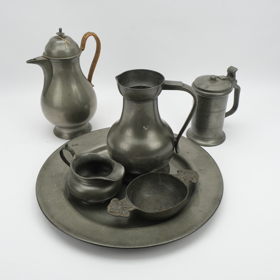 Lot divers tin, waaronder een schotel, schenkkan en pul.