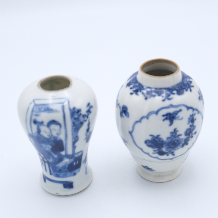Lot van twee Chinees porseleinen theebusjes: een 18e eeuwse Chinees porseleinen theebus met floraal decor, en een 19e eeuws Kangxi revival theebusje met blauw-wit decor van lijzen