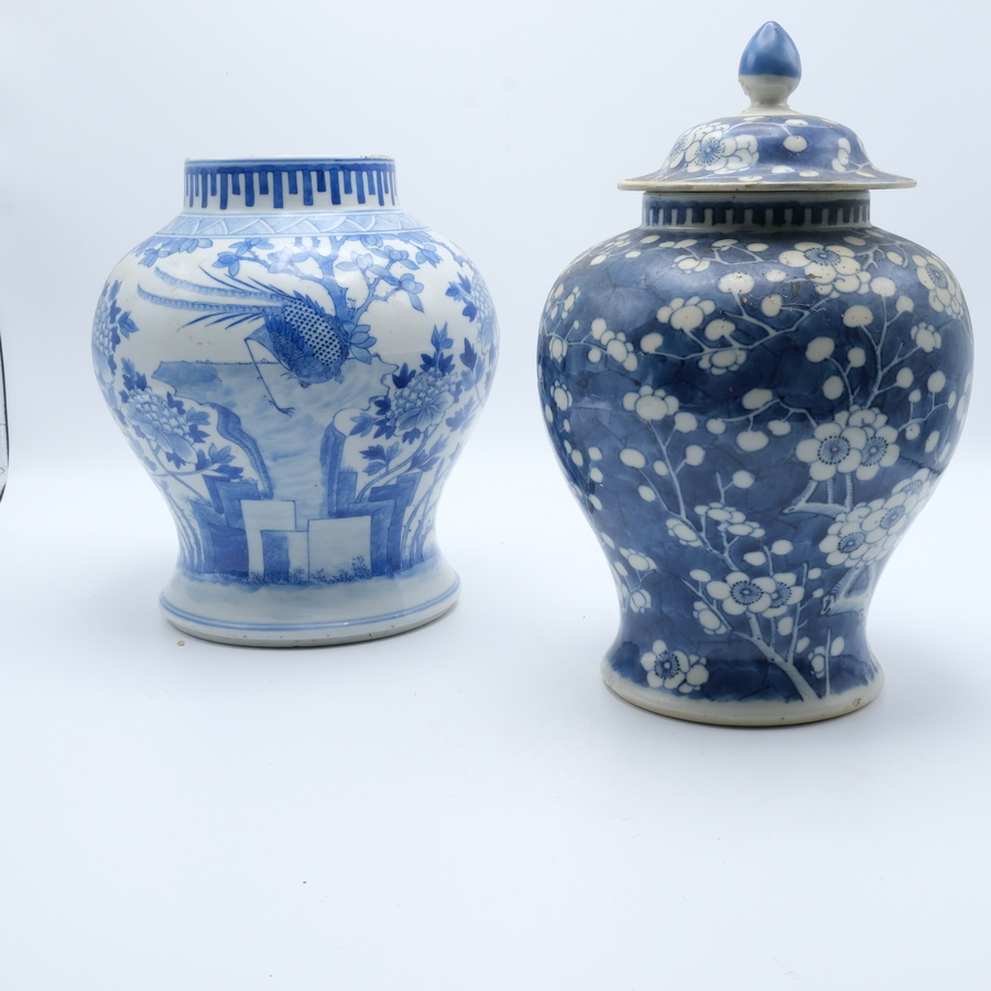 Twee 19e eeuwse Chinees porseleinen balustervazen, Blauw/wit met decors van bloesemtakken en een goudfazant op de rotsen bij pioenrozen.