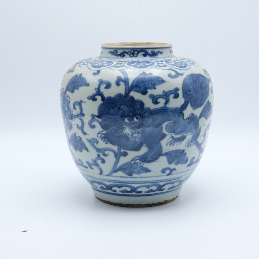 Een Chinees porseleinen gemberpot. Blauw/wit met een decor van twee tempel leeuwen tussen pioenrozen. Gemerk met konijntje op de onderzijde.