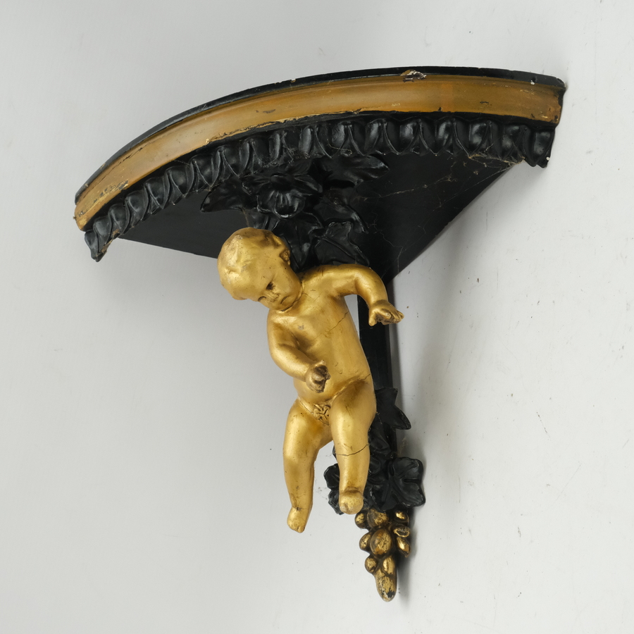 Een zwart gelakte hoek console versierd met een gestoken en verguld houten putto.