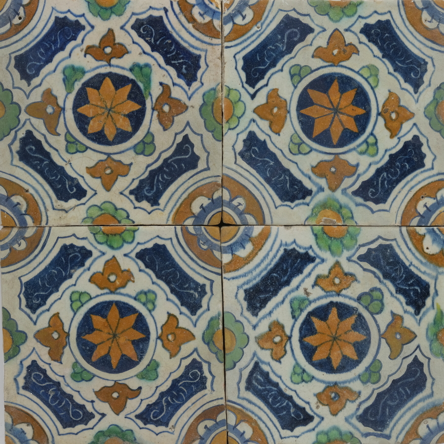 Vier antieke 17e eeuwse ornamenttegels, polychroom decor met stermotief