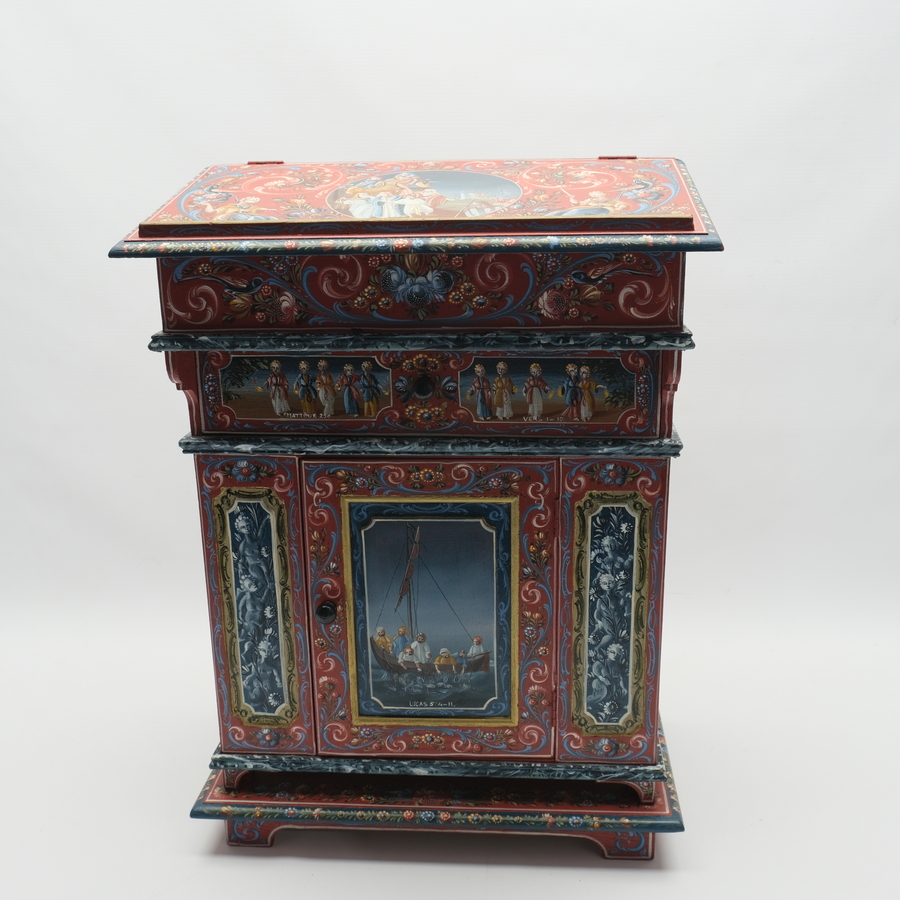 Een model van een houten en Hindelooper beschilderde lessenaar. Met een Bijbelse voorstellingen en rondom florale decors. Op een origineel plateau. Toegeschreven vervaardigd en beschilderd door ...