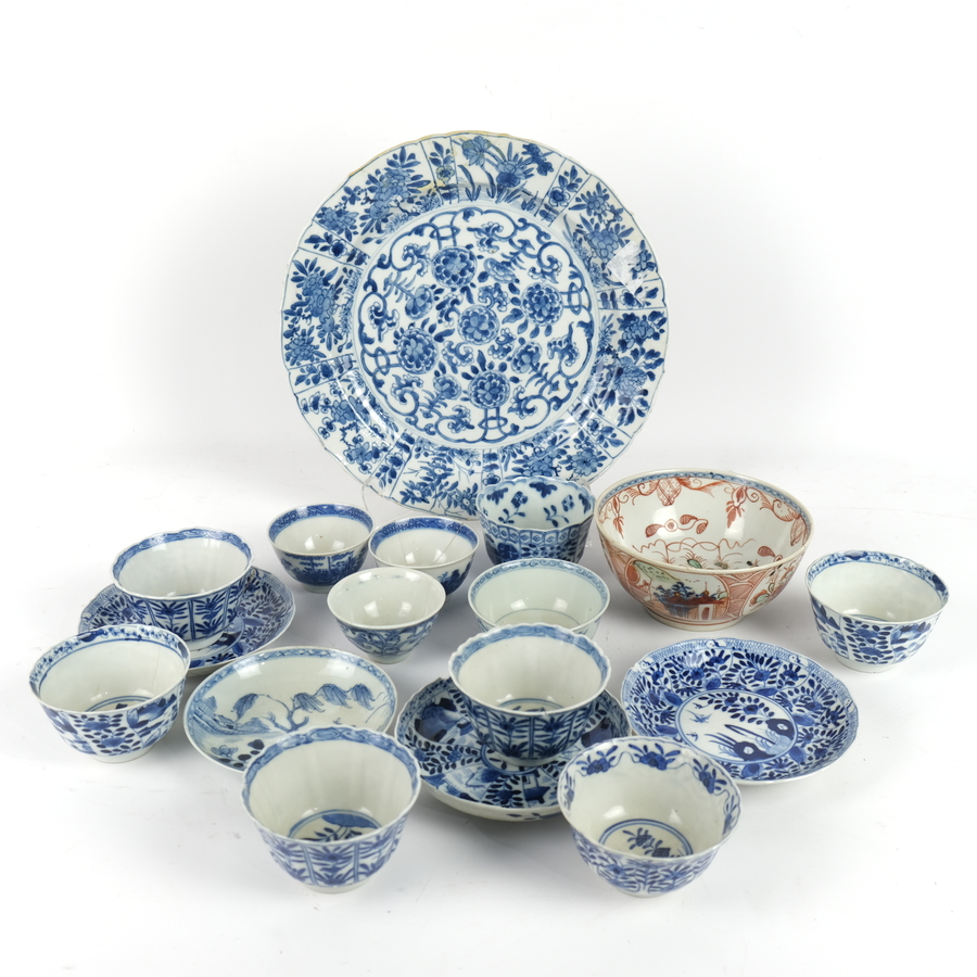 Lot divers Chinees porselein, waaronder een Kangxi schotel (27,5 cm) met floraal decor, gemerkt met zeskaraktermerk, met hoek gelijmd, en een Amsterdams Bont kom, Qianlong, met kleine randbescha...
