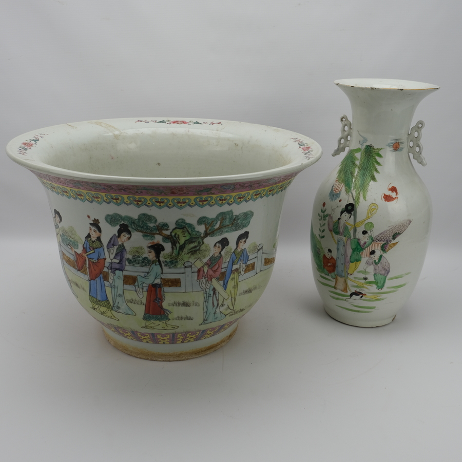 Chinese vaas en Chinese porselein bloempot met decor van figuren en kalligrafie gedicht op de achterzijde, Republiek periode