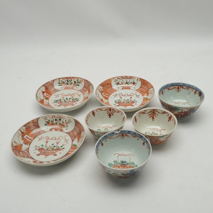 Lot van drie schotels en vier kopjes, Amsterdams Bont 18e eeuw.