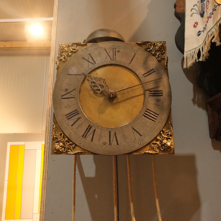 Een 18e eeuwse klok met bronzen wijzerplaat, slinger en twee gewichten. gesigneerd Judocuo de Badto 1741