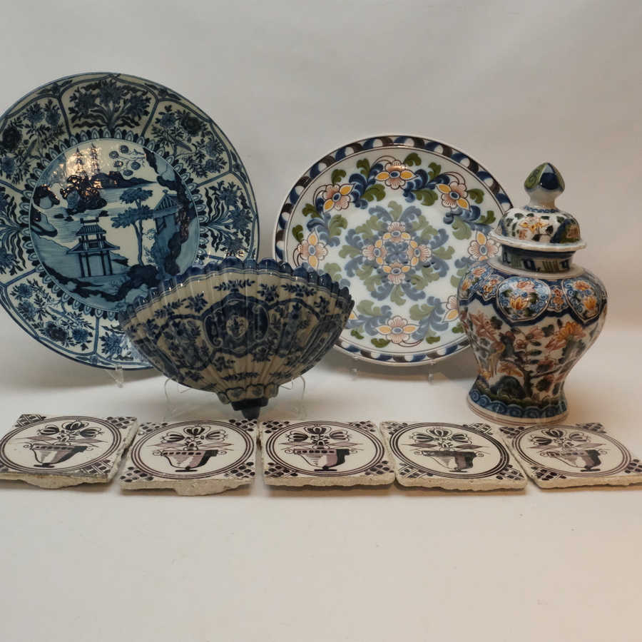 Lot divers Tichelaar Makkum: één met floraal decor, doorsnede 36 cm. Eén met blauw-wit chinoiserie decor, doorsnede 39 cm, gerestaureerd. Een polychroom gedecoreerde dekselvaas, 31 cm hoog, in g...