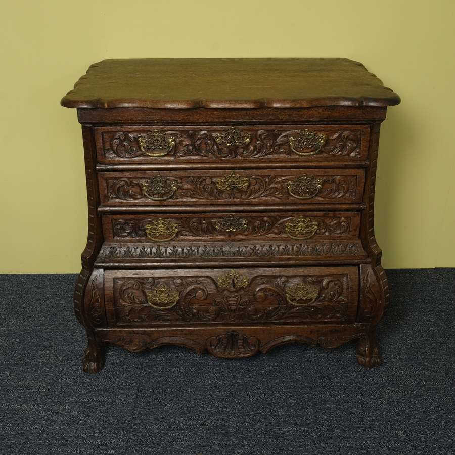Een vroeg 19e eeuws eikenhouten commode met gestoken decor van acanthusbladeren en schelpmotieven, met messing beslag, vier laden en gecontourneerd blad