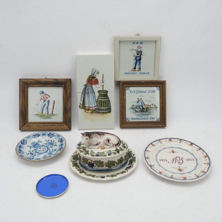 Lot divers 20e eeuws Tichelaar Makkum, waaronder diverse tegels, twee wandbordjes en een botervloot bekroond met een koe, aan de binnenzijde gemerkt ‘Botercontrolestation Noord-Holland 1920-1960...