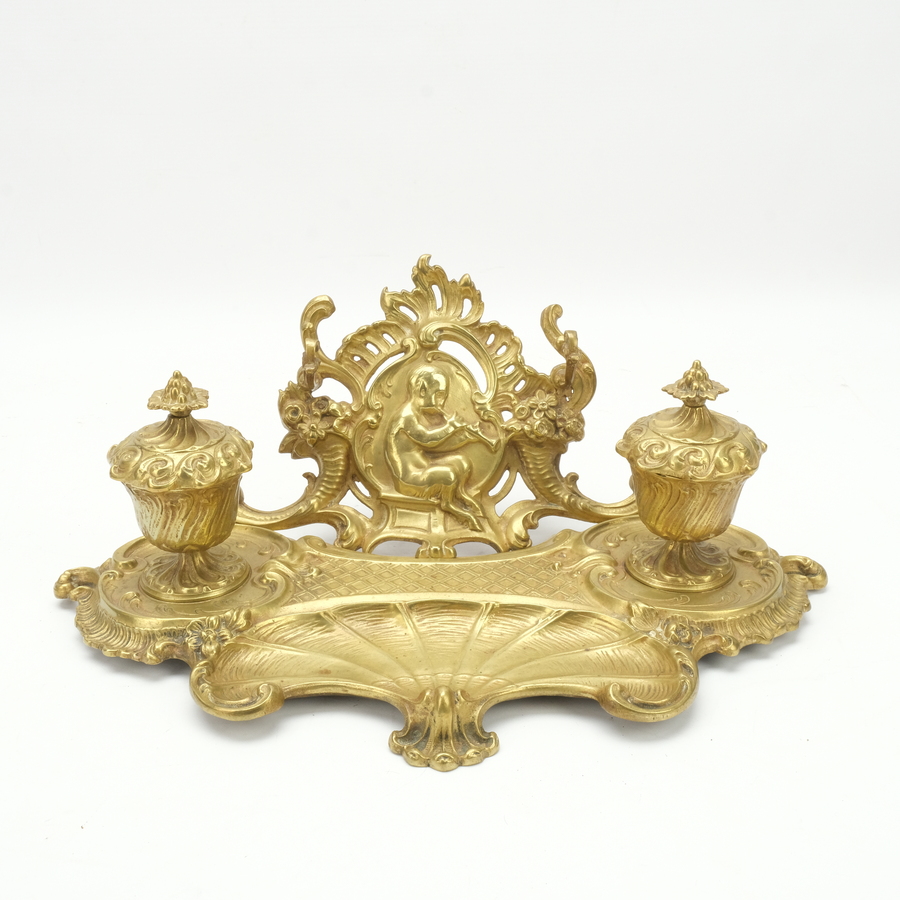 Een antiek bronzen inktstel, versierd met o.a. rocailles en schelpmotieven, met twee inktpotjes. Frans, eind 19e eeuws