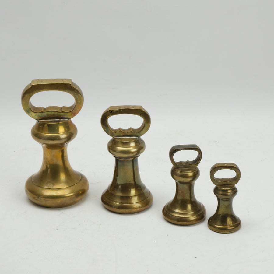 Lot van vier Engelse krukgewichten, vroeg 20e eeuws. Geijkt aan de onderzijde, één bovenop gemerkt 'WCD (?) & SONS'