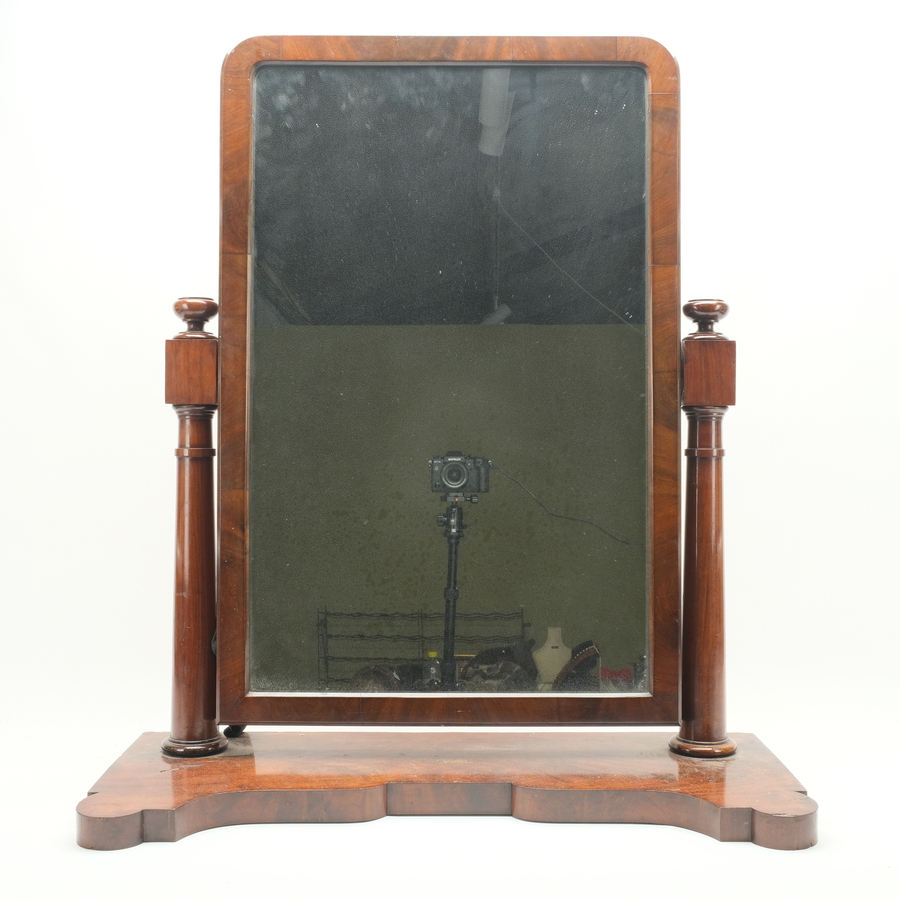 Een antieke 19e eeuwse mahoniehouten gefineerde kapspiegel, groot formaat.