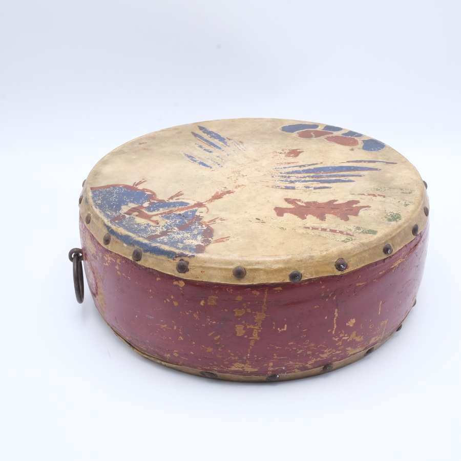 Een antieke 19e of vroeg 20e eeuwse houten trommel met beschilderd leder, decor van vogels aan beide kanten.