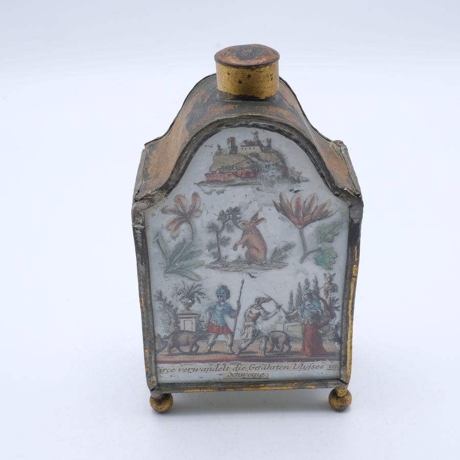 Een 18e eeuwse Duitse blikken theebus met glazen plaatjes versierd met ingekleurde kopergravures, geplaatst op bolpootjes. 15,5 cm hoog