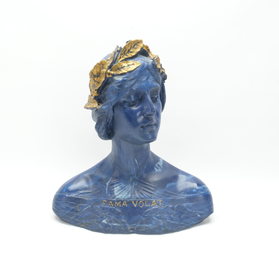Een 20e eeuwse blauwe buste van een vrouw met lauwerkrans en opschrift ‘Fama volat’, naar Emilio Fiaschi (1858-1941). 39 cm hoog