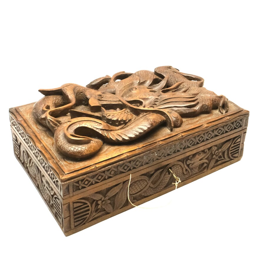 Een 19e eeuwse of vroeg 20e eeuwse Chinese houten kist met gestoken decor van draken.