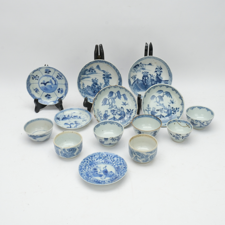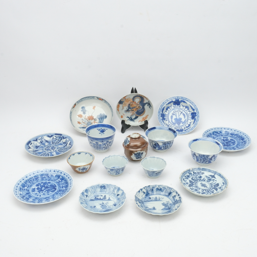 Lot divers Chinees porselein: negen schotels, zes kopjes en een 18e eeuws capucijner dekselpotje