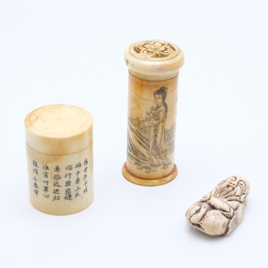 Lot van drie stuks antiek Chinees been: twee dekseldoosjes en een netsuke.