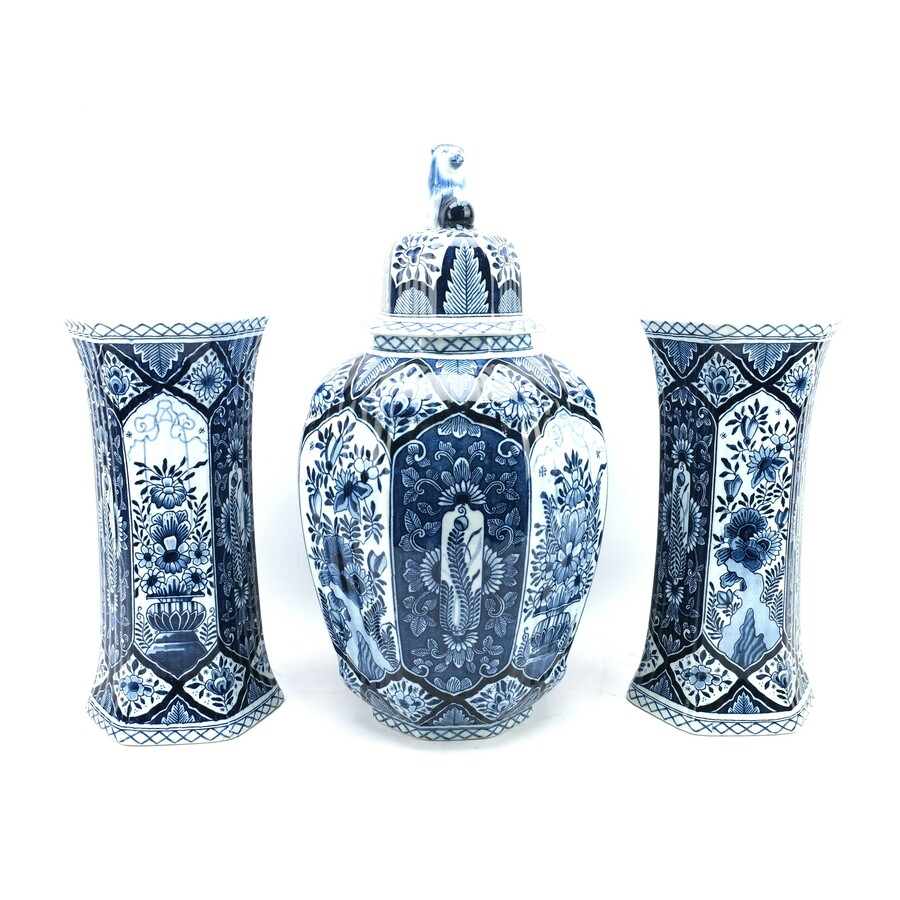 Een uitzonderlijk groot 20e eeuws blauw-wit kaststel, twee trompetvormige zeskantige vazen en één balustervormige zeskantige dekselvaas bekroond met leeuw.