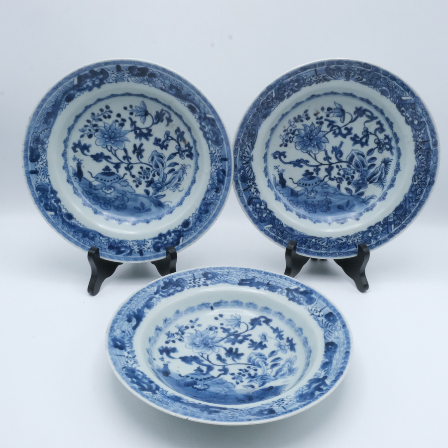 Drie gelijke 18e eeuwse Chinees porseleinen diepe schotels. Blauw/wit met vlinders op de randen en Chinese tuin op het plat.
