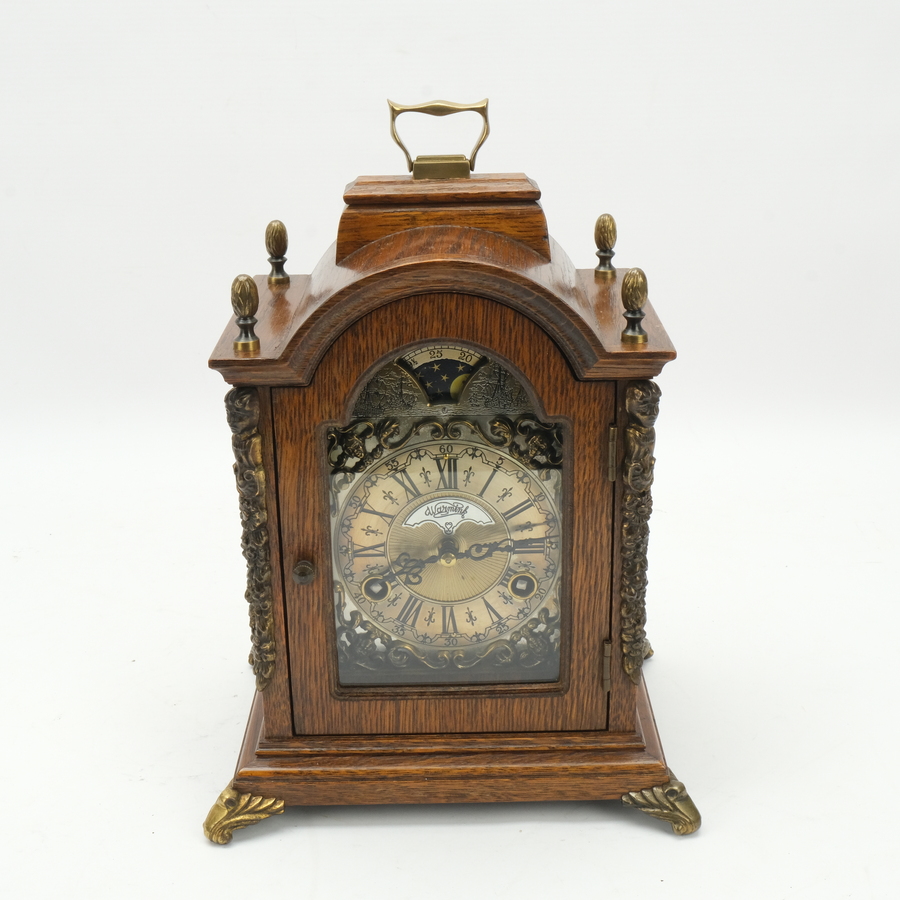 Een 20e eeuws eikenhouten tafelklokje met maanstand en bronzen montuur, Wuba/Warmink