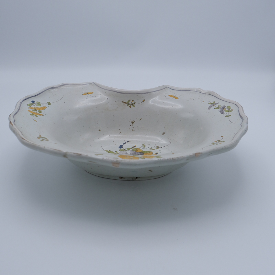 Een antieke Frans aardewerken scheerkom. Polychroom beschilderd met florale motieven. 19e eeuws of ouder.