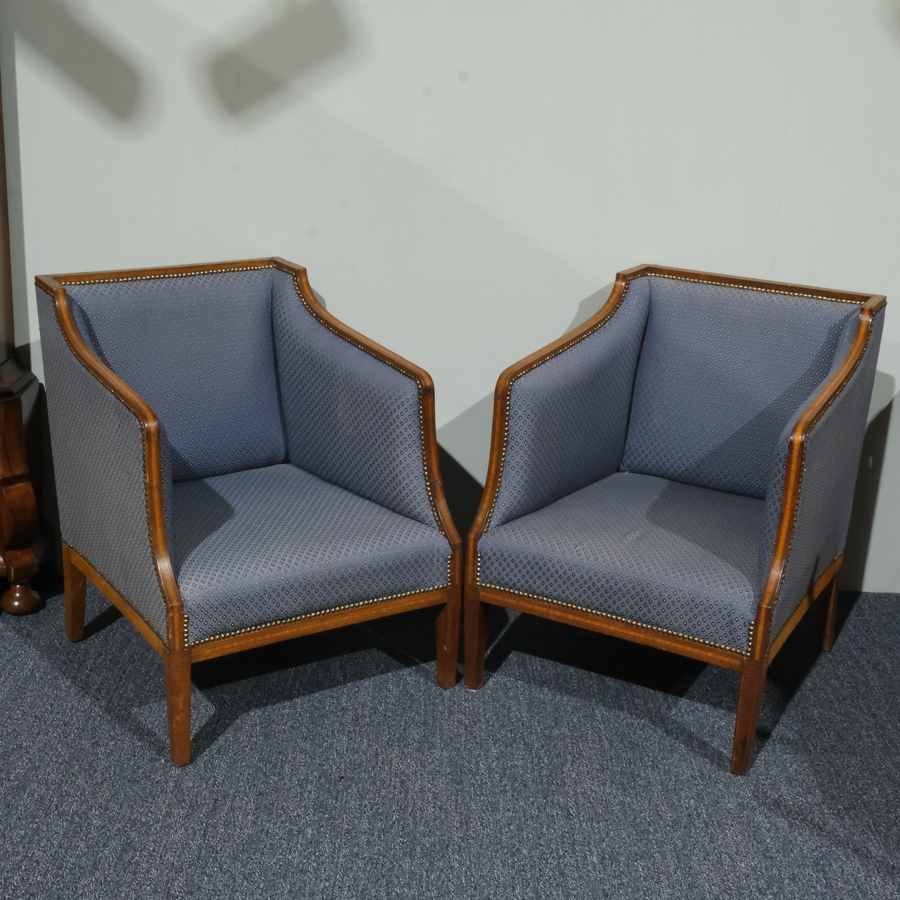 Lot van twee 20e eeuwse fauteuils, houten intarsia rand met blauwe bekleding