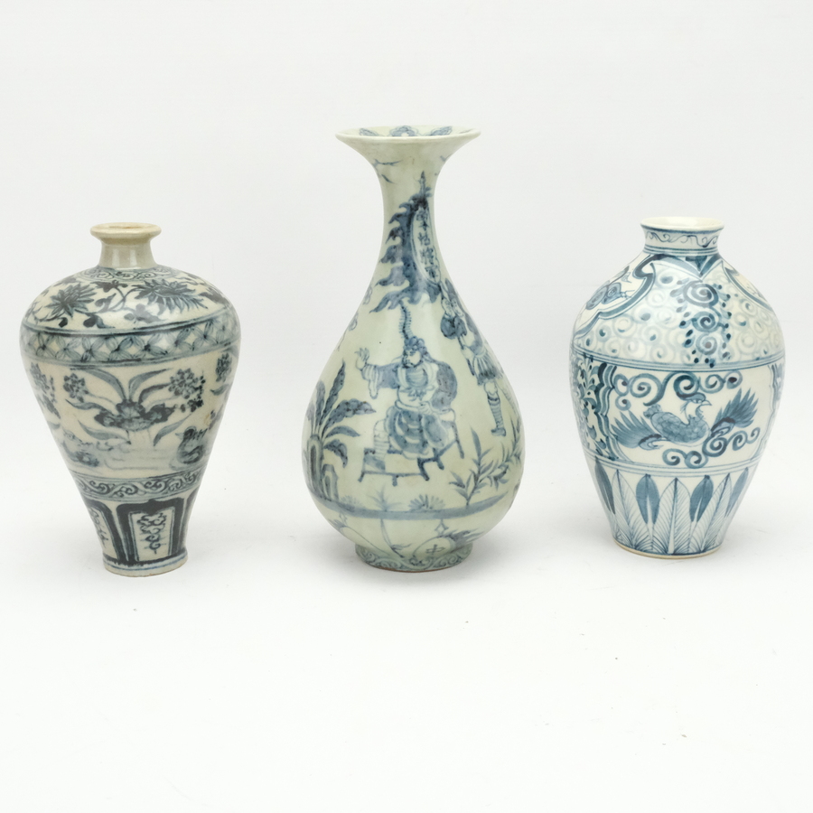 Drie Chinees porseleinen vazen, baluster en Meiping modellen. Blauw/wit met een decors van phoeniksen, krijgers en eenden. In de Ming style. 20e eeuws.