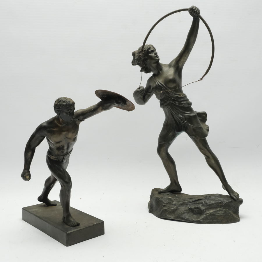 Twee zamakken sculpturen van een boogschutter en een Romeinse strijder met schild. Vroeg 20e eeuws.