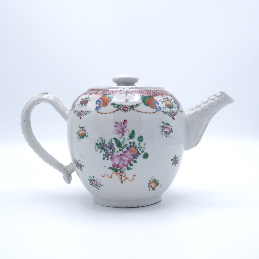 Een grote antieke 18e eeuwse Chinees porseleinen theepot, Qianlong periode (1735-1796), met relief op greep en tuit en Famille Rose decoratie van bloemen en vlinders