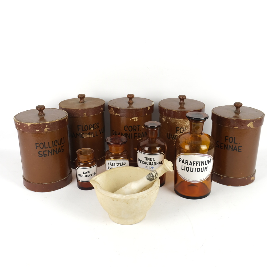 Lot diverse apothekersbenodigdheden, bestaande uit vijf 20e eeuwse houten & kartonnen apothekerspotten, vier glazen apothekerspotten en een porseleinen vijzel, gemerkt Mason Cash.