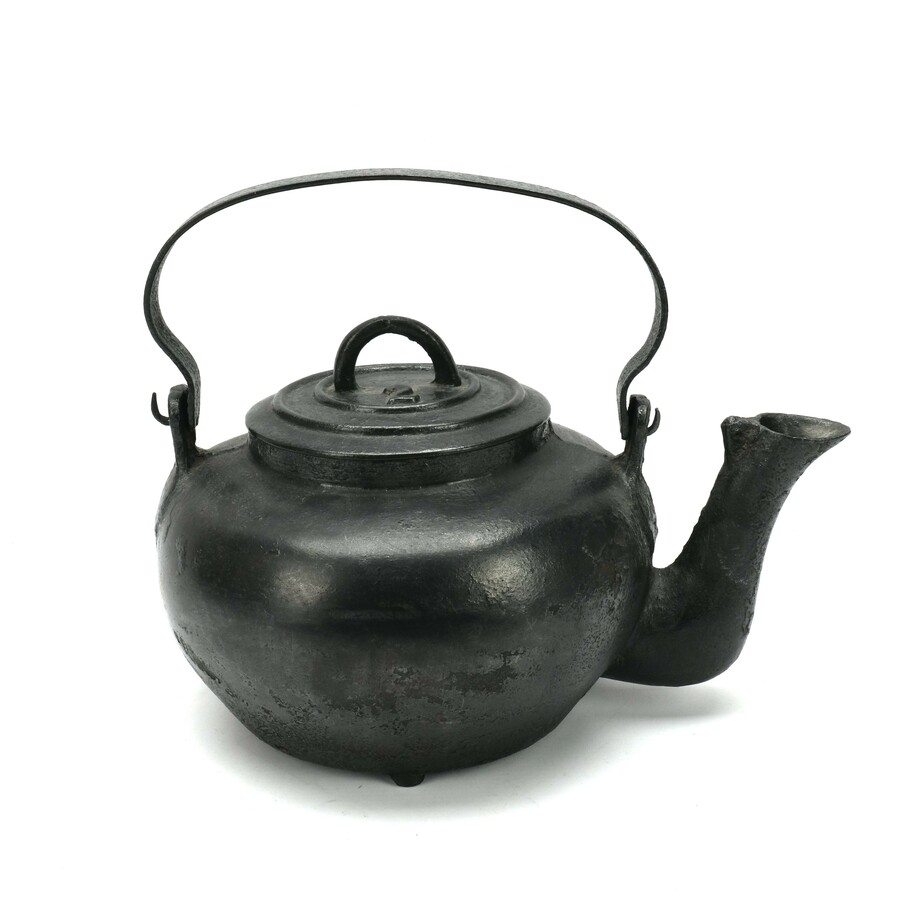 Een grote 19e eeuwse zwarte gietijzeren ketel, gemerkt '2' aan de bovenzijde
