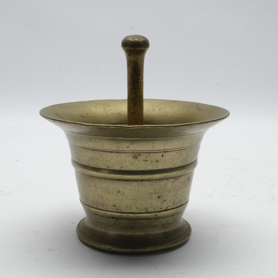 Een antieke 18e/19e eeuwse bronzen vijzel met kleine stamper. Onderop met stickertje 'Granada'