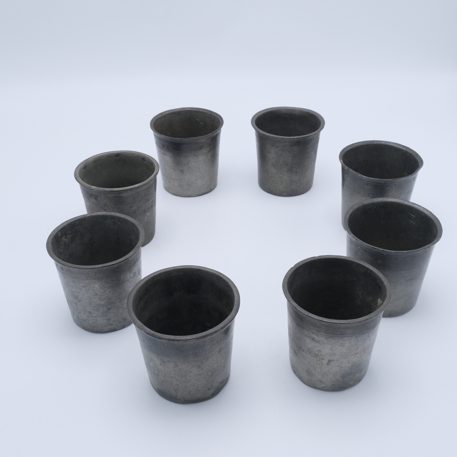 Lot van acht antieke tinnen bekers. Herkomst: volgens overlevering uit een klooster.