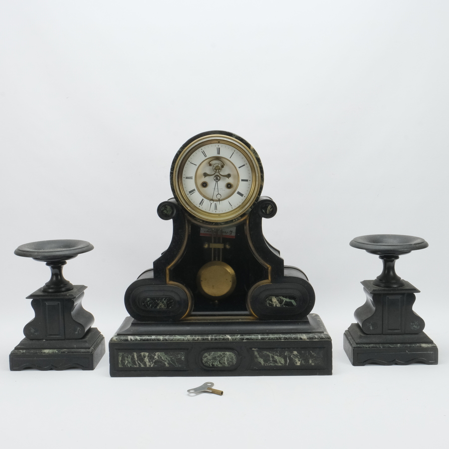 Een laat 19e eeuwse Franse marmeren pendule met twee sierurnen. Wijzerplaat gemerkt 'Charvet Ainé Oger de la Ville Lyon'. Het uurwerk gemerkt 'S. Marti Medaille de Bronze'