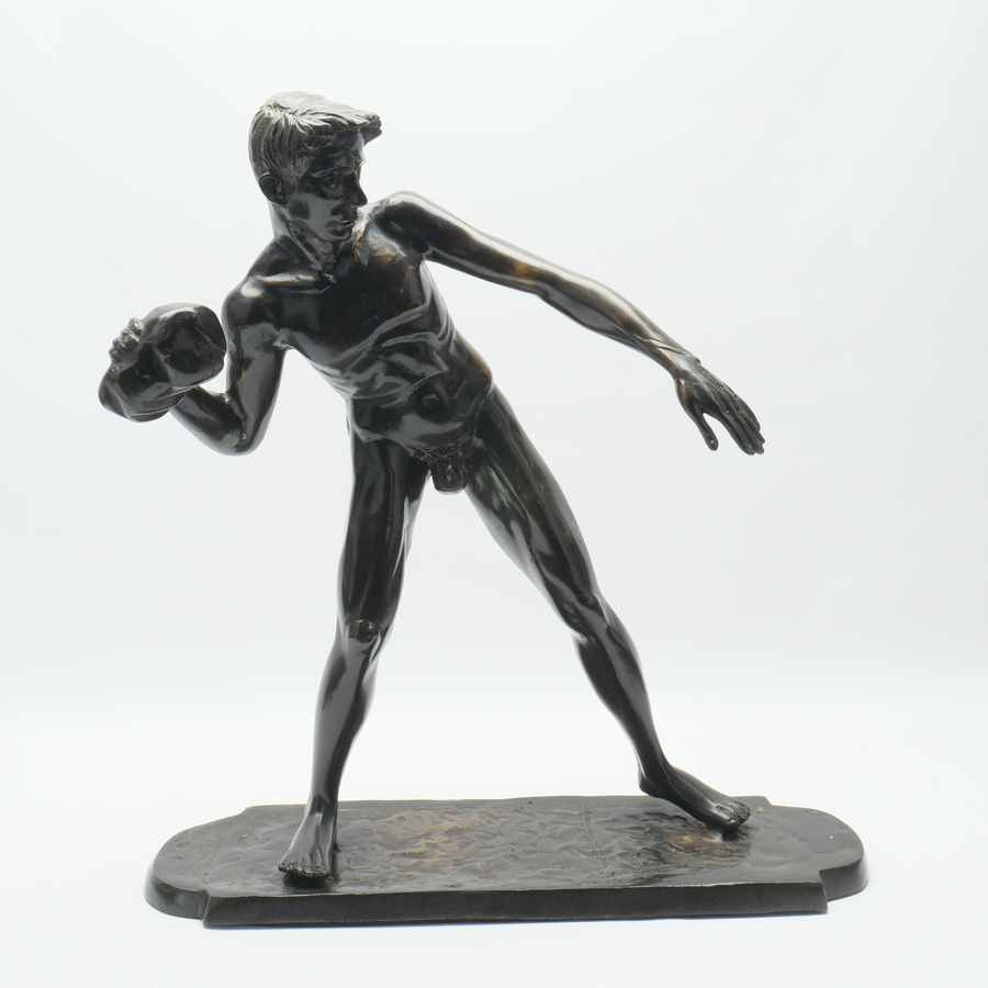 Een 20e eeuws bronzen beeld, voorstelling van David die een steen gooit