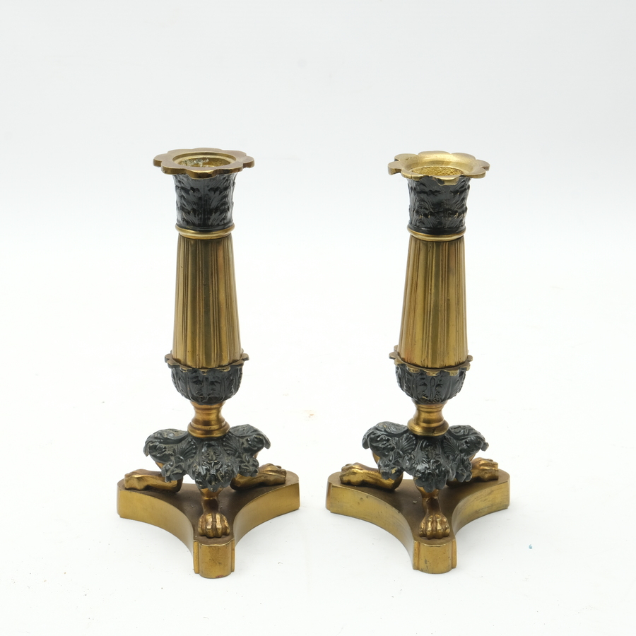 Lot van twee antieke kleine Empire stijl bronzen kandelaren, gedeeltelijk verguld, op driepoots voet.