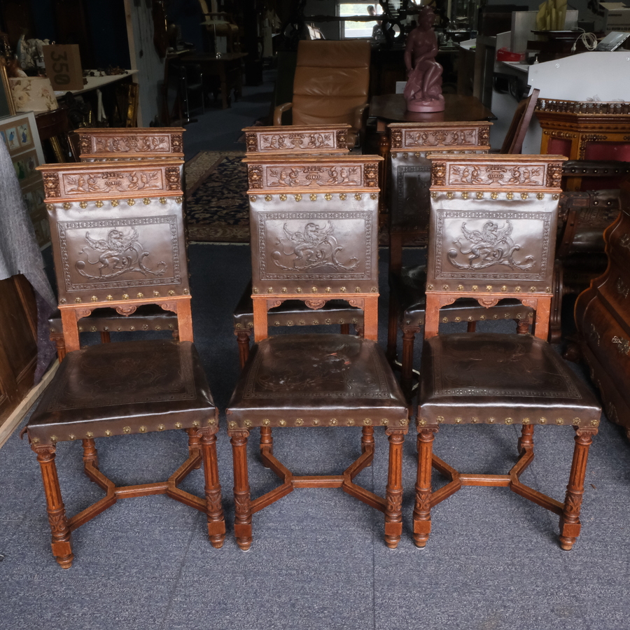 Lot van zes 19e eeuwse eikenhouten stoelen, Renaissancestijl, met lederen bekleding. Met gestoken leeuwenmascarons en ornamentiek, het leder met voorstelling van griffioenen.