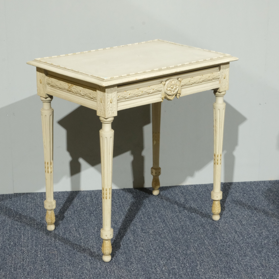 Een antiek grijs theetafeltje met lade, versierd met o.a. rozet en gecanneleerde poten. Louis Seize stijl, ca. 1900