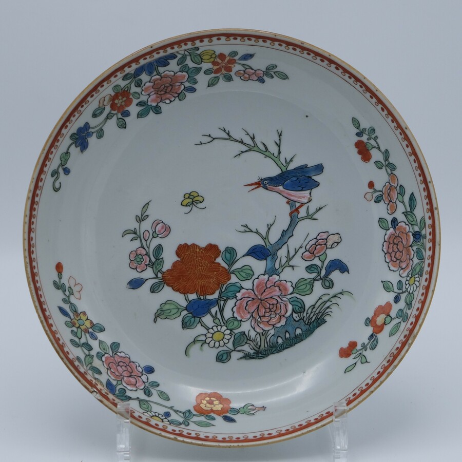 Een 18e eeuwse Chinees porseleinen schotel. Famille rose met een decor van een vogel op een tak met pioenrozen. Kleine rand beschadiging