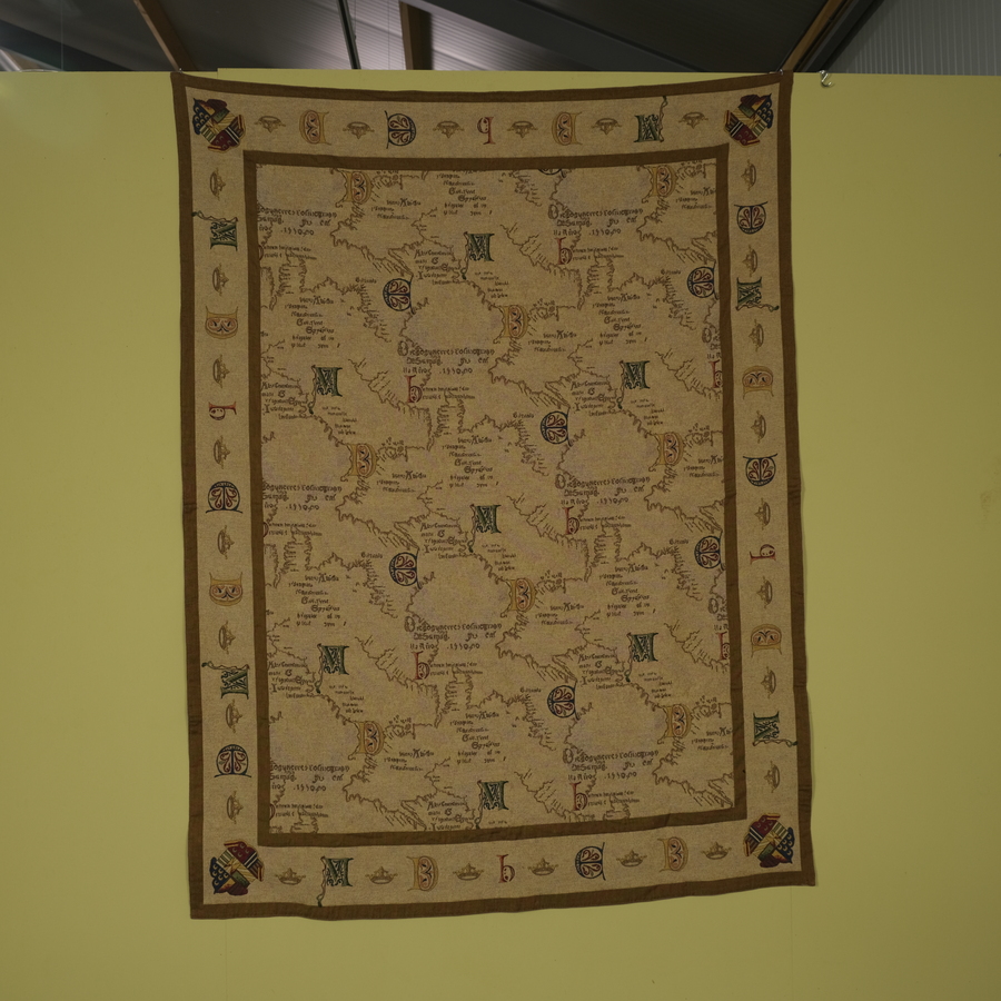 Een groot geweven wandkleed/ gobelin. Met een voorstelling van een fantasie landkaart. 20e eeuws.