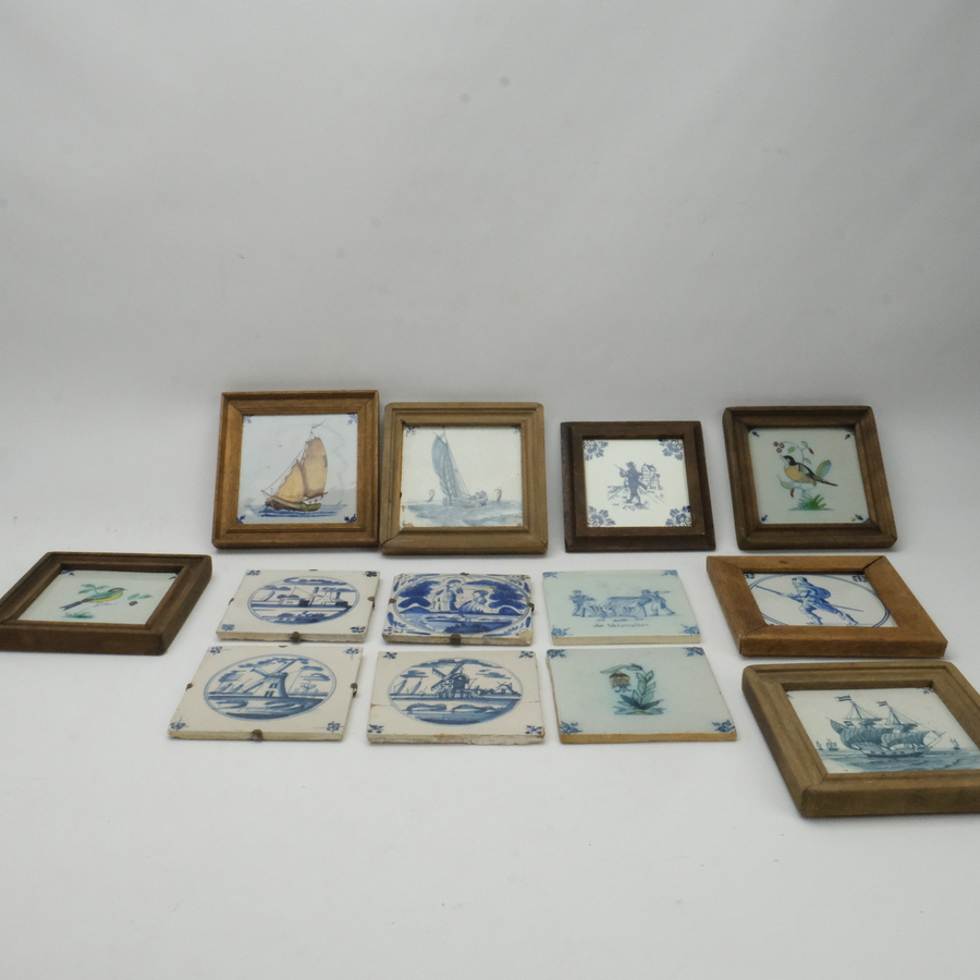 Een lot met dertien diverse Hollandse tegels, 18e, 19e en 20e eeuws met diverse voorstellingen, waaronder schepen, dieren en bloemen. Sommige in lijsten