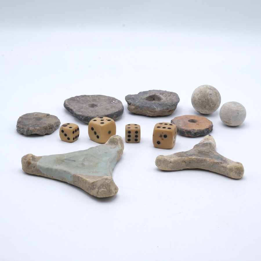 Lot diverse bodemvondsten, waaronder dobbelstenen en proenen