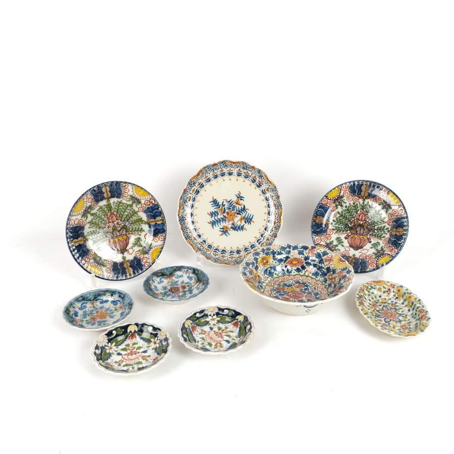 Lot divers aardewerk, bestaande uit negen polychroom gedecoreerde Tichelaar Makkum schoteltjes en kommetjes en divers Royal Copenhagen, model Blue Fluted. Betreft twee mokkakopjes met schoteltje...